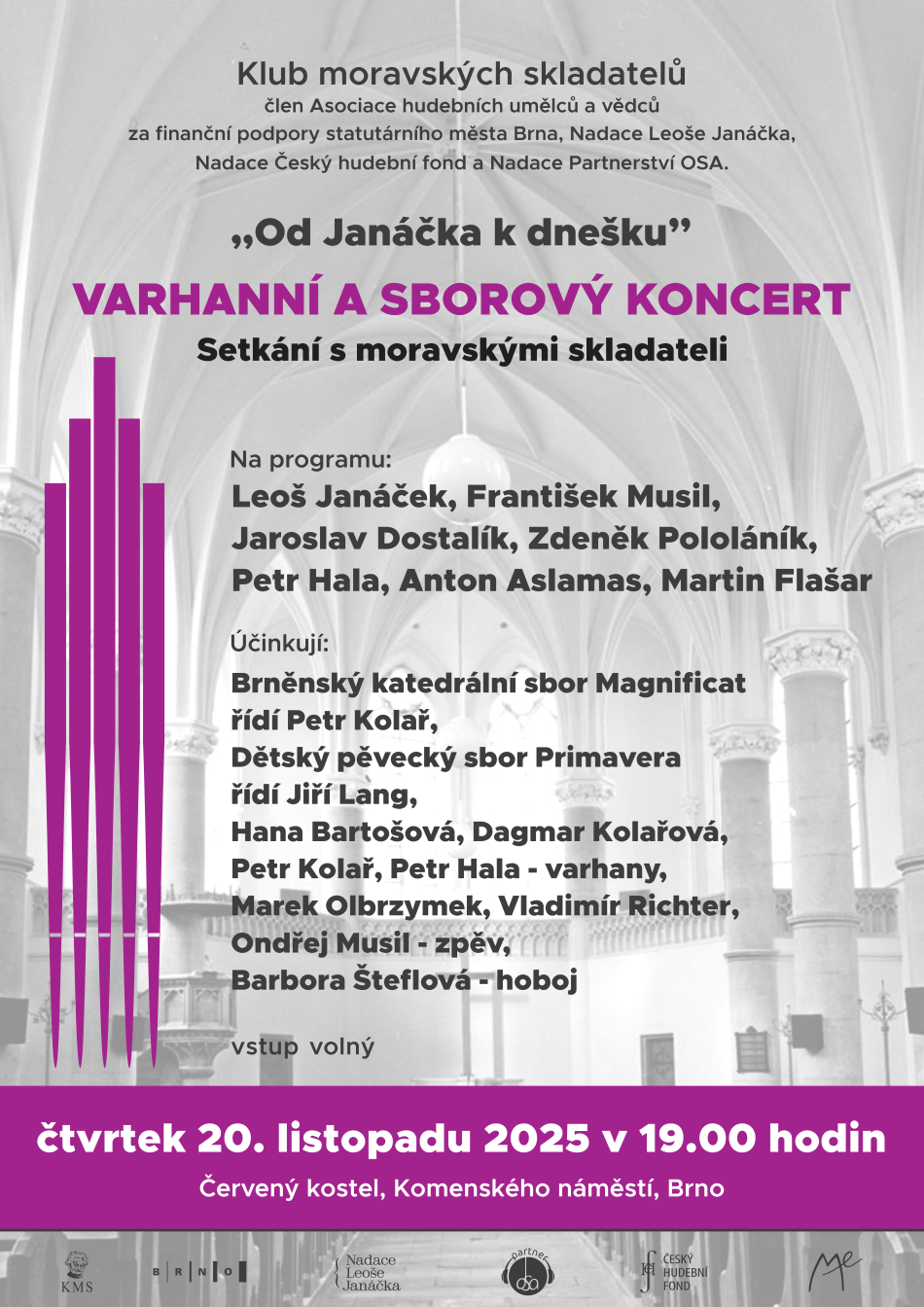 Na programu zazní nejkrásnější sborové skladby s varhanami ve vzpomínkách na moravské skladatele Leoše Janáčka, Františka Musila, Jaroslava Dostalíka, Zdeňka Pololáníka a představí i současníky.