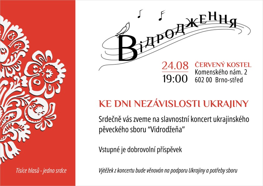 Dne 24. srpna v 19.00 se v Červeném kostele uskuteční koncert ukrajinského pěveckého sboru “Vidrodžeňa” ke Dni nezávislosti Ukrajiny.