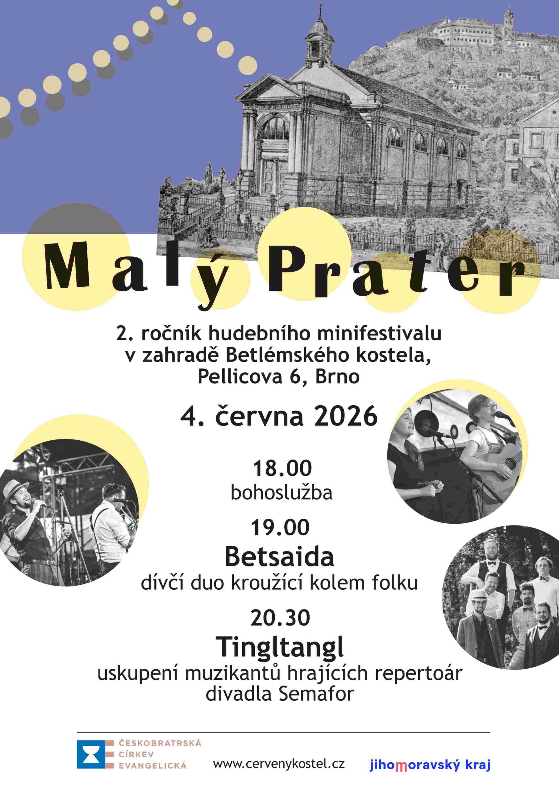 4 4. června 2026 Vás zveme ke 2. ročníku Malého Prateru na zahradě Betlémského kostela. Zahájíme v 18 hodin bohoslužbou. Od 19.00 hodin bude hrát dívčí duo Betsaida a od 20.30 uskupení muzikantů Tingltangl.