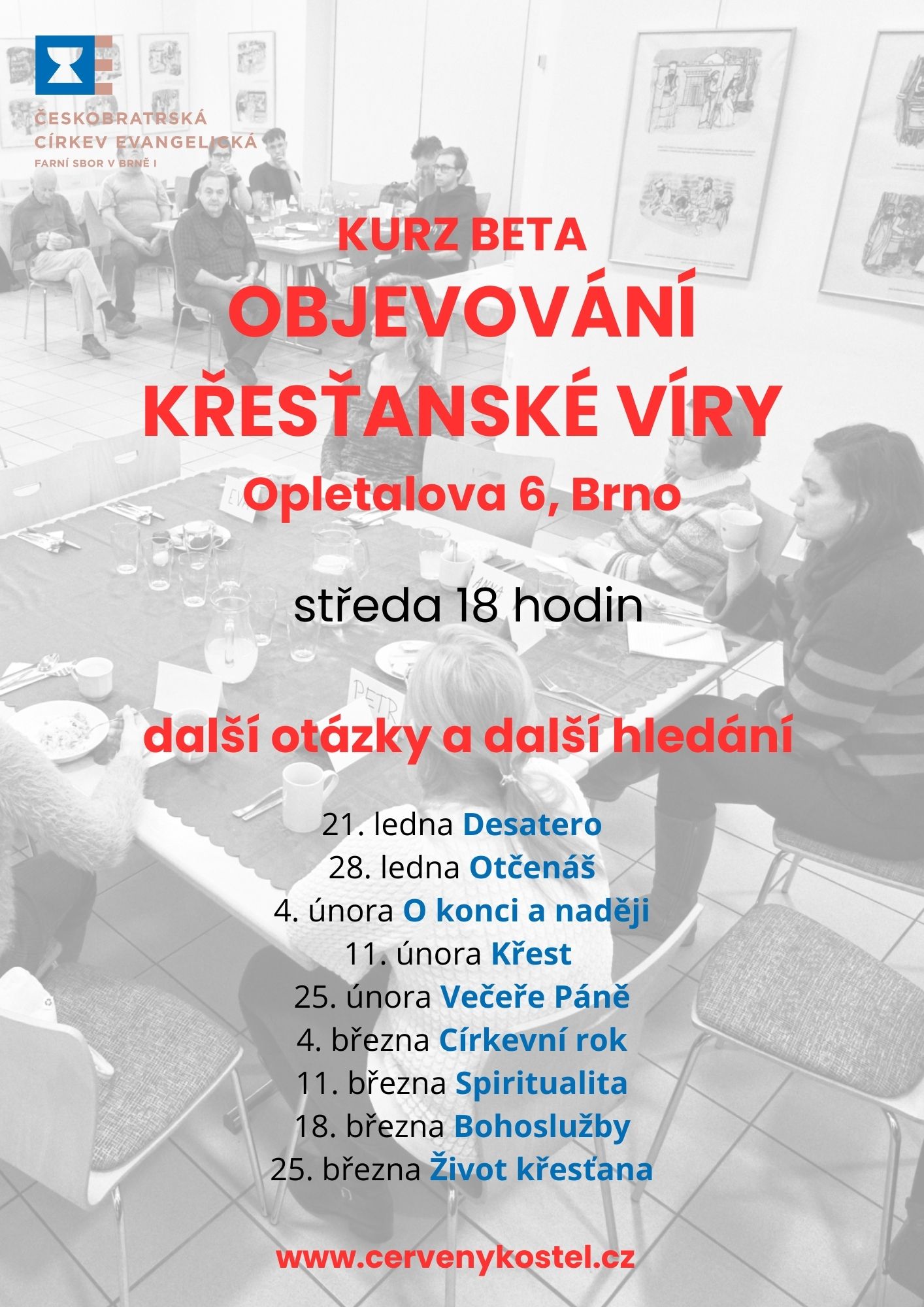 4 Začíná kurz beta. Je určen každému, kdo by se chtěl dozvědět víc o křesťanské víře. Bude ve středu od 18 hodin na Zelené faře.