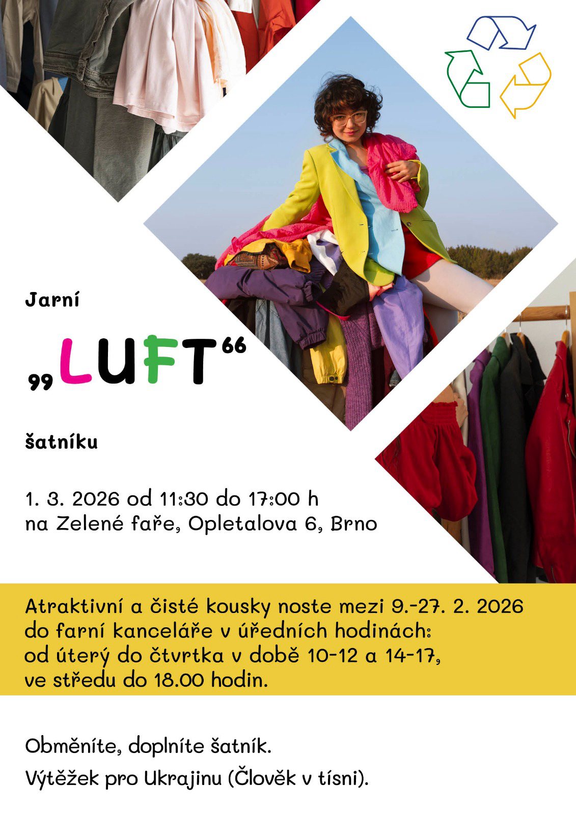6 1. března 2026 proběhne Jarní “LUFT” šatníku. Akce se uskuteční na Zelené faře od 11.30 do 17.00 hodin. Nejde o sbírku šatstva, ale o přátelskou výměnu či bazárek oblečení, které byste si sami oblékli. Atraktivní a čisté kousky noste mezi 9. – 27. 2. 2026 do farní kanceláře v úředních hodinách. Výtěžek z akce bude použit pro Ukrajinu prostřednictvím sbírky Člověka v tísni.