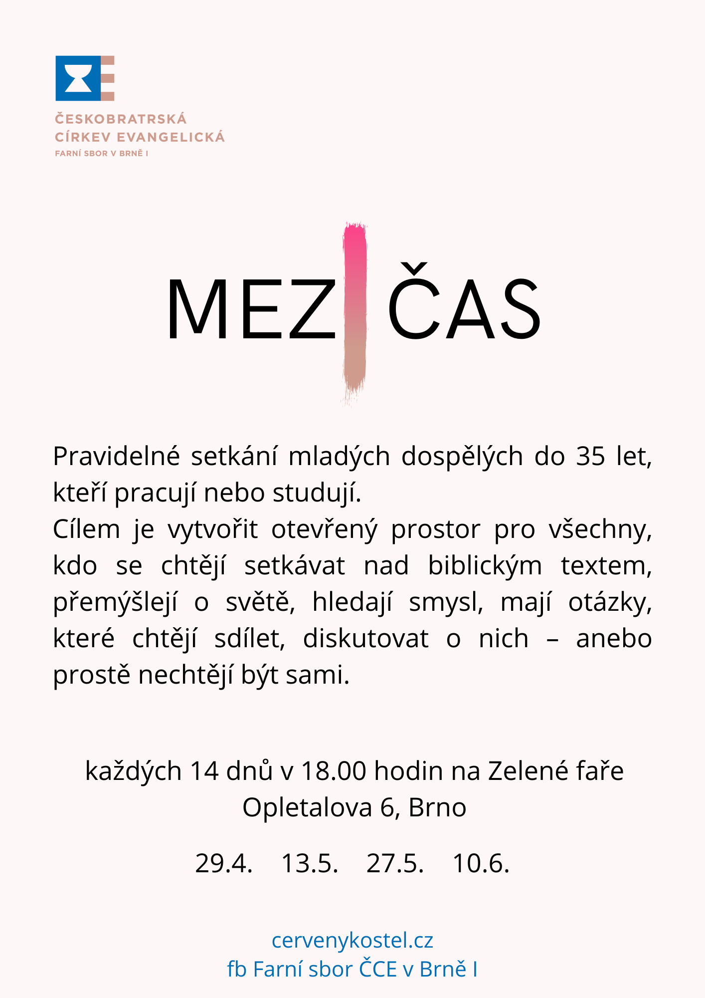 2 V úterý 29. dubna v 18 hodin bude první Mezičas. Pravidelné setkání mladých dospělých do 35 let, kteří pracují nebo studují. Cílem je vytvořit otevřený prostor pro všechny, kdo se chtějí setkávat nad biblickým textem, přemýšlejí o světě, hledají smysl, mají otázky, které chtějí sdílet, diskutovat o nich – anebo prostě nechtějí být sami. Každých 14 dnů v 18.00 hodin na Zelené faře Opletalova 6, Brno. (29.4.; 13.5.; 27.5.; 10.6.).