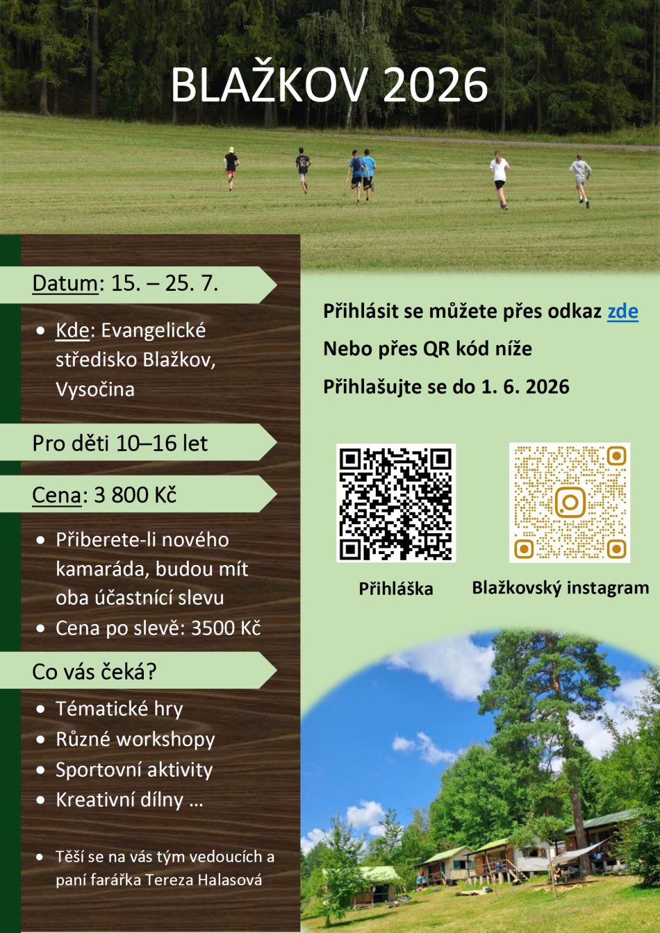 10 Od 15. do 25. července 2026 se uskuteční v součinnosti s Brněnským seniorátem tábor YMCA na Blažkově pro děti od 6. až 9. třídy. Bližší informace najdete na plakátu v příloze zpráv nebo na nástěnkách.